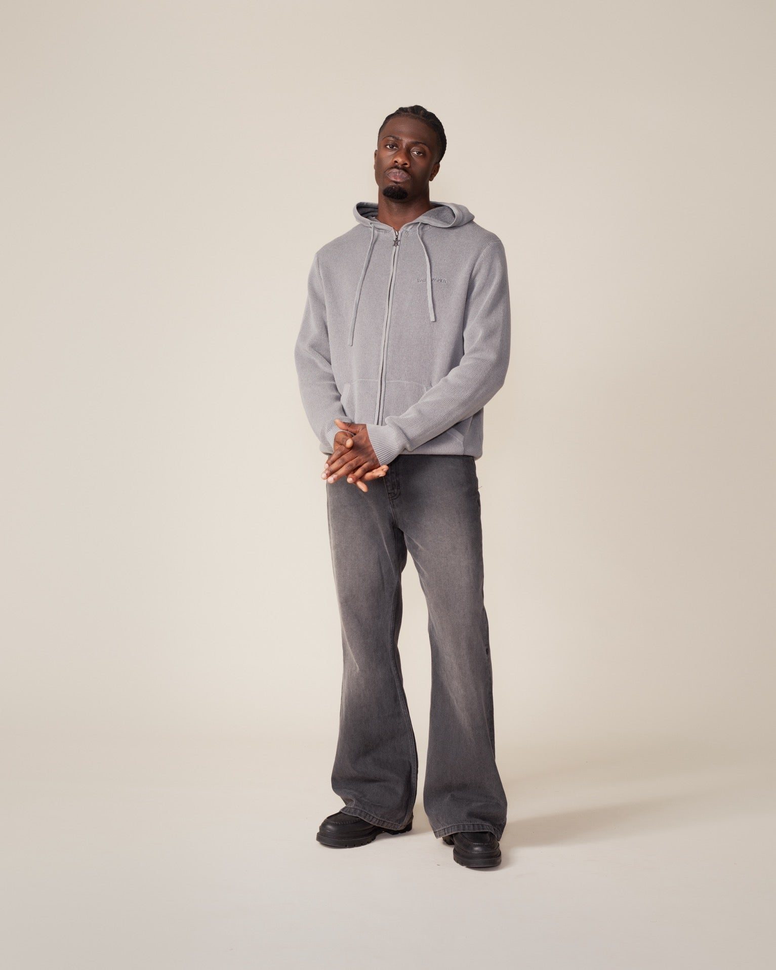 This men's knitted hoodie features a zipper closure at the front and drawstrings on the hood. Designed with ribbed cuffs and hem, it offers a comfortable fit and classic style. A small embroidered chest logo adds subtle branding, while the kangaroo pocket provides extra practicality. Made from soft, high-quality cotton knit.
